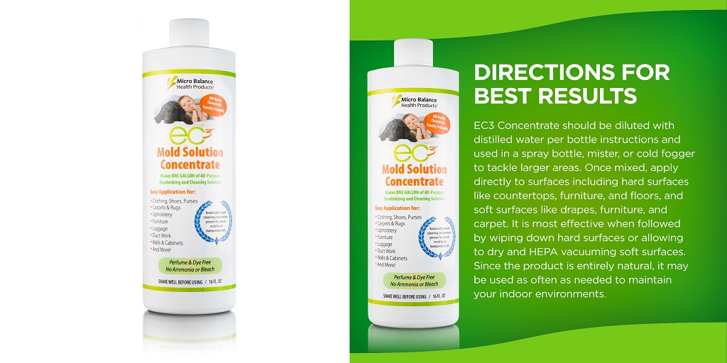 A product like EC3 Mold Solution Concentrate works by addressing mold at the spore level rather than just wiping away what you can see. When diluted and used as directed, it can be sprayed or misted onto both hard and soft surfaces.